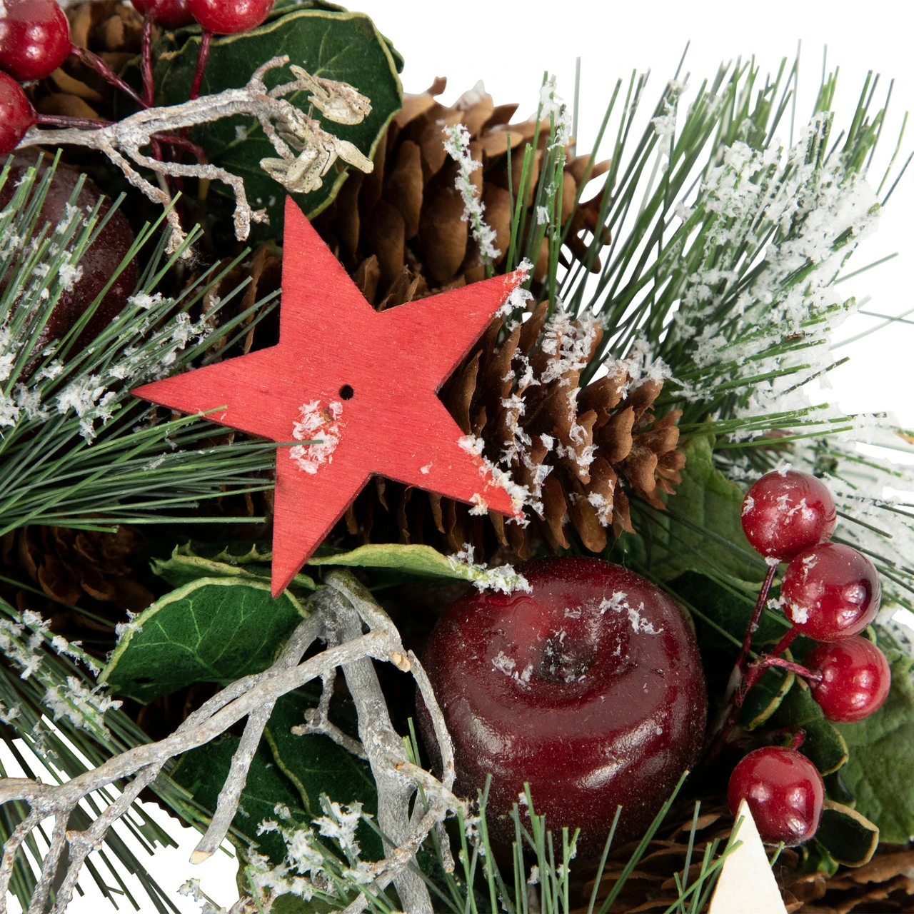 Accented with twigs, dry leaves, red berries, pine cones and apples