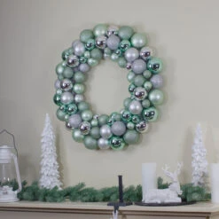 Silver And Seafoam Green 3-Finish Shatterproof Ball Christmas Wreath – 24-Inch, Unlit